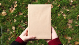 A closed book in a cover made of craft paper in female hands with green grass and fallen yellow leaves in the background. Flat lay, top view. Template, layout. Copy space.