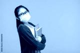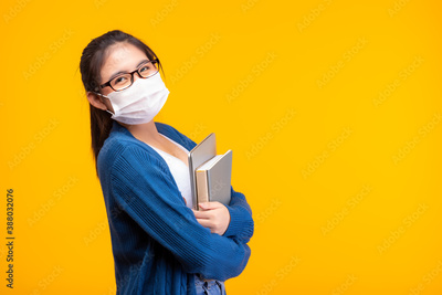 Happy asian female college student wear protective face mask for protecting coronavirus, holding laptop computer and text book. Youth girl student get ready for going back to school. education concept