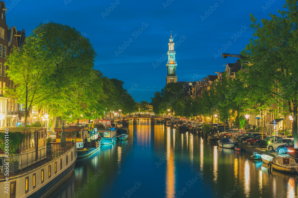 Westerkerk church tower at canal in Amsterdam, Netherlands