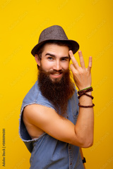 Positive attractive man in denim t-shirt and grey hat with long beard showing ring gesture ok isolated on yellow background. He is OK, approval.