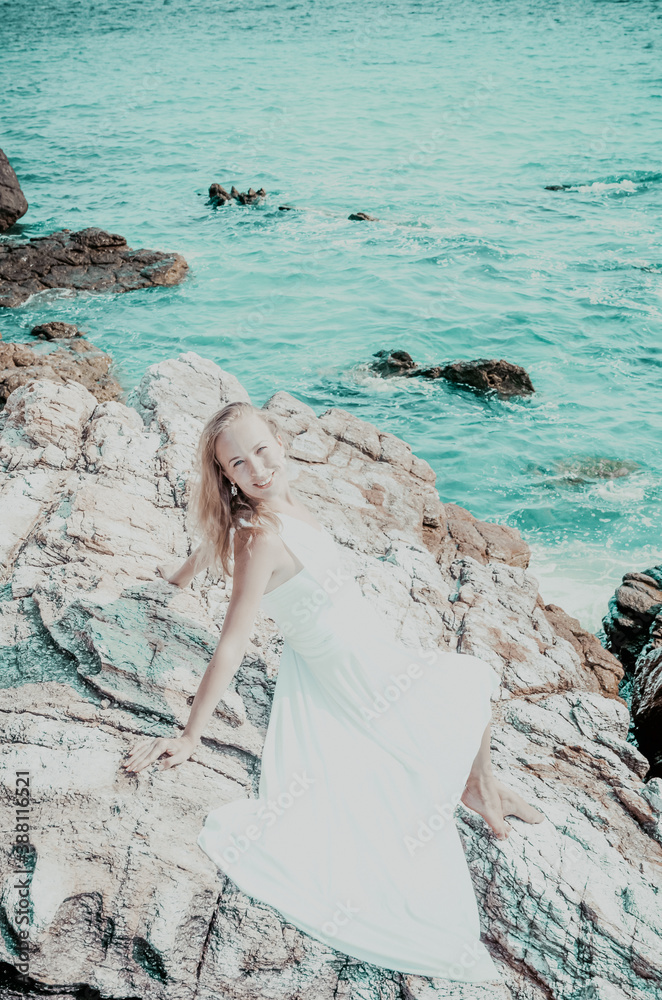 Beautiful blond bride in white wedding dress stand on sea shore. Tropical sea and rrocks on the background. Summer vacation concept.