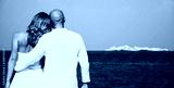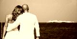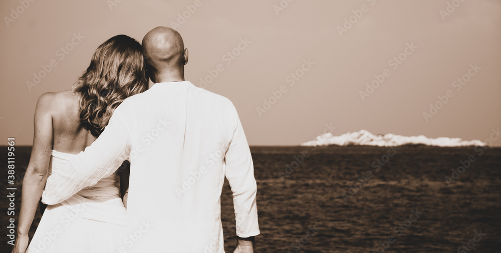 Beautiful blond bride in white wedding dress stand on sea shore. Tropical sea and rrocks on the background. Summer vacation concept.