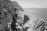 Girl sits on the edge of a cliff and looks at the sea