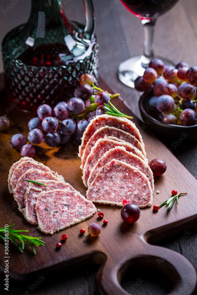 Saltufo - Italian salami delicacy, salami with summer truffle coated with Parmesan cheese with red wine and grapes