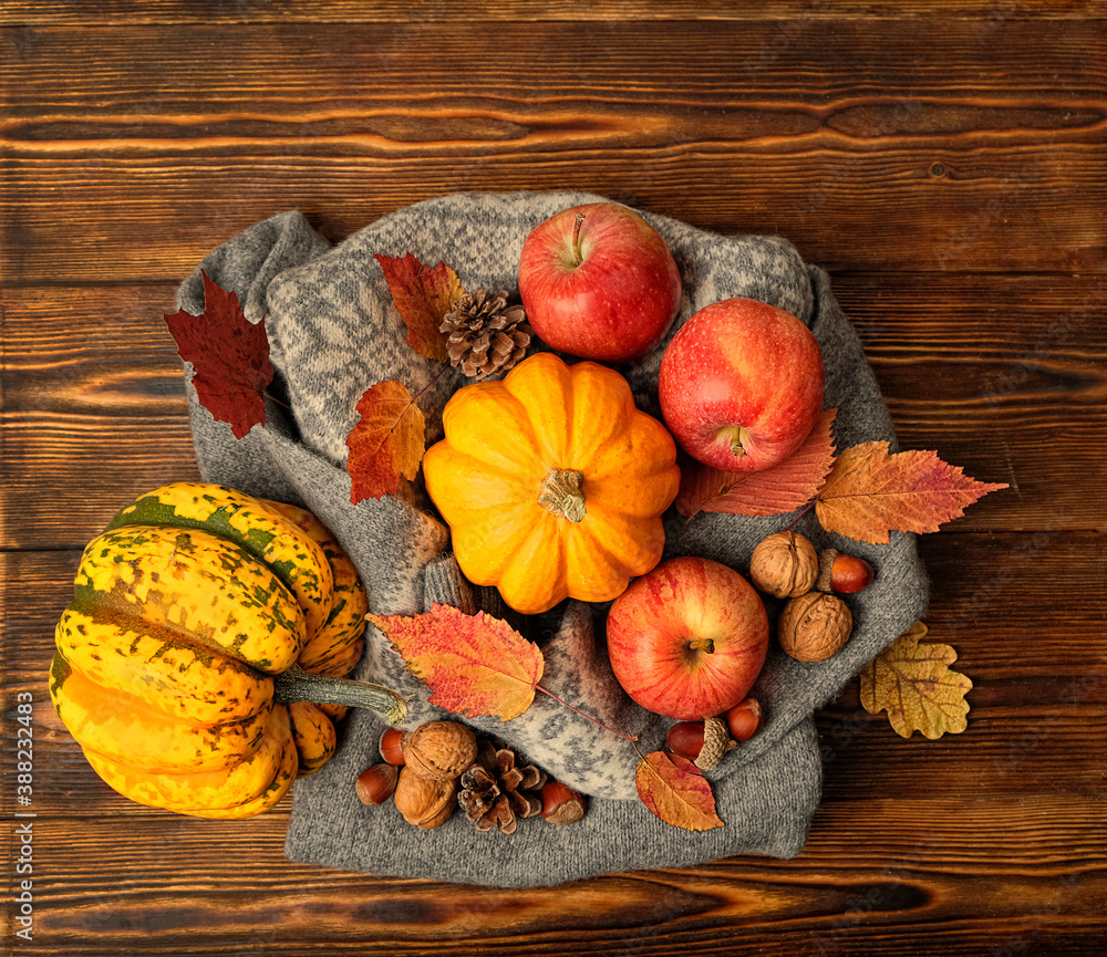 autumn composition with pumpkins, apple, leaves, sweater on wooden table. fall harvest season, thanksgiving holiday, Halloween concept. flat lay