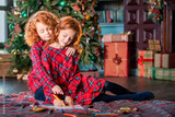 Two red-haired curly-haired girls write letter to Santa against the backdrop of Christmas tree and a decorated room.