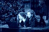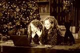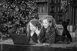 Funny red-haired children next to Christmas tree and gifts communicate online through a laptop.