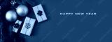 Happy new year. Christmas gift, fir tree branches and Christmas ornament on red background. Flat lay, top view.