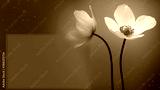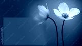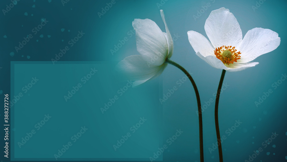White beautiful primrose. Flowers on a green stem. Beautiful turquoise floral greeting card. Nature.