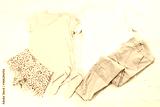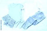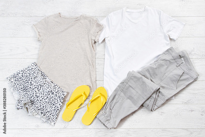Male and female T shirt white and flip flops. T-shirt Mockup flat lay with summer accessories. Jeans and flip-flops on wooden floor background. Copy space. Template blank canvas.