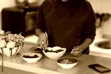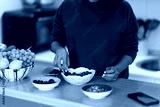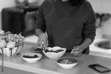 Brunette woman making a healthy yogurt and fruit breakfast.