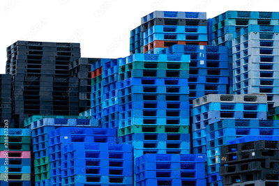 Pile of plastic shipping pallet isolated on white. Industrial plastic pallet stacked at factory. Cargo and shipping. Plastic pallet rack for export delivery industry. Plastic pallet storage warehouse.