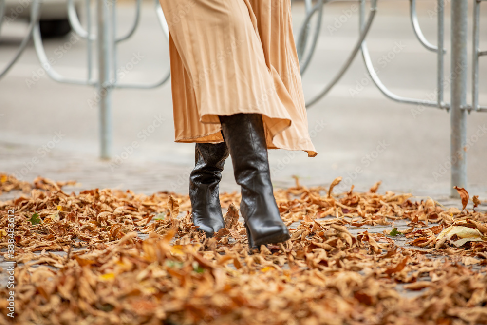 Woman legs in boots and long skirt walking in autumn park
