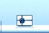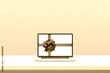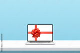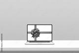 Laptop with ribbon and bow on display. Minimal concept of Christmas shopping