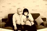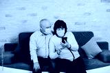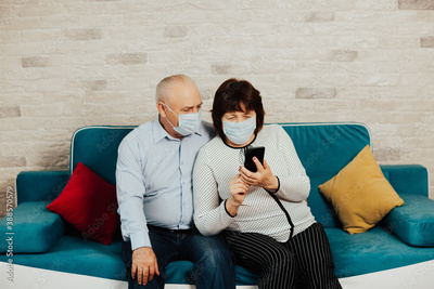 Happy elderly couple in the medical face masks sitting on the sofa at home and is having a video call. Quarantine. Health concept.