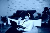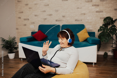 Adult woman with headphones sitting on the yellow armchair in living room country house make video call look at pc screen wave hand greeting children and grandchildren.