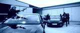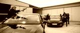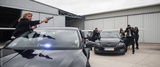 Famous female celebrity with bodyguards surrounded. VIP security agents and close protection officers