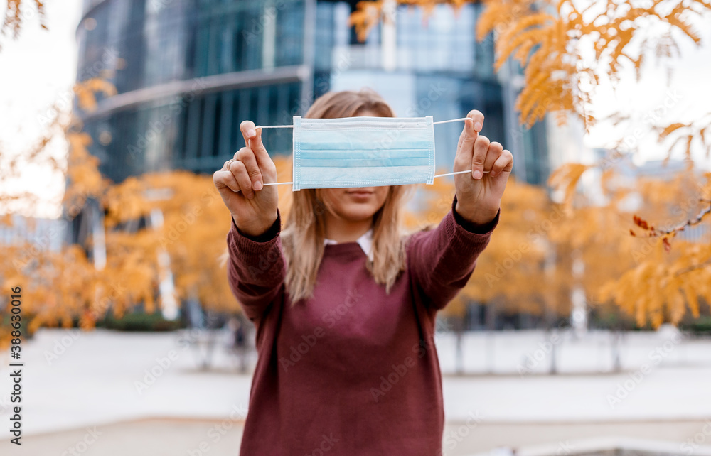 The girl holds a medical mask in front of her. Mask in the hands of a woman. Focus on the suit. Autumn time.