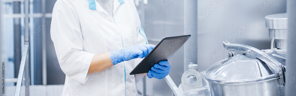Factory worker inspecting production line tanker in of dairy factory with computer tablet. Concept food industry banner