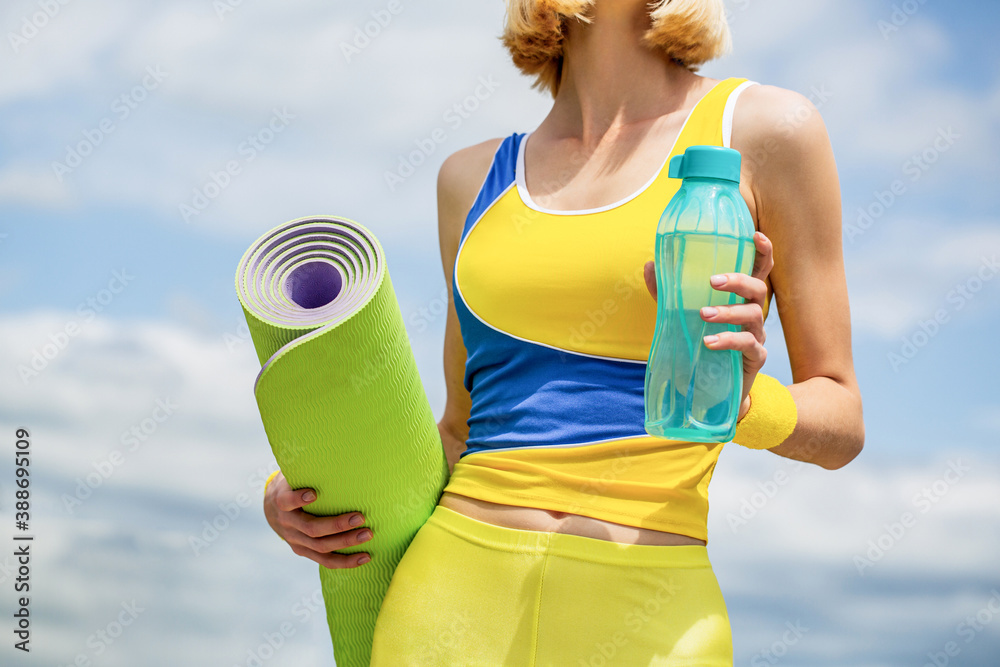 Yoga mat and water bottle. Fitness girl with yoga mat