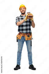 profession, construction and building - happy smiling male worker or builder in helmet with boards over white background