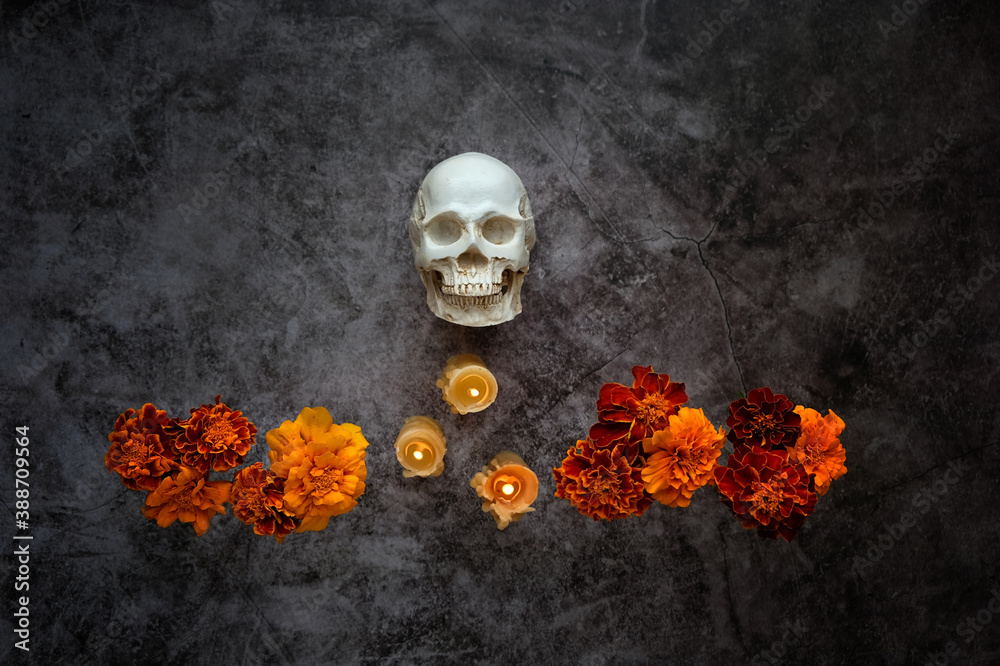 skull, candles and orange flowers on dark background. traditional cempasuchil flowers. dia de los Muertos holiday background. flat lay, copy space