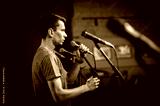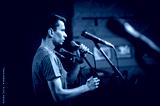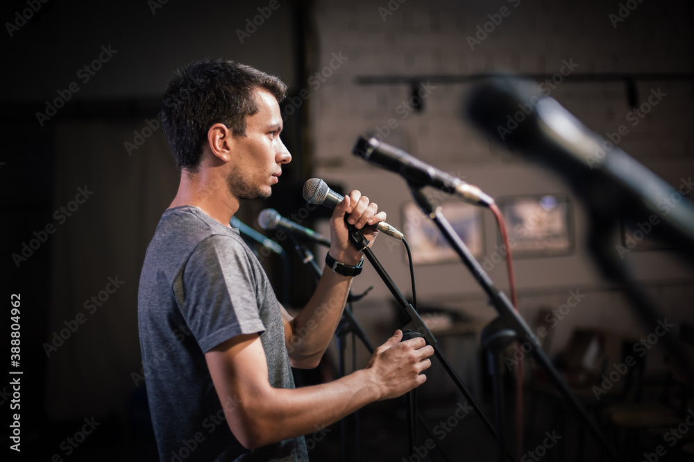 Theater audio technician adjusting an microphones on the scene. Installing and testing the sound system in the background