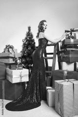 Glamorous blonde woman in a red evening dress with Christmas and New Year gifts on a white background in the studio.