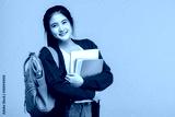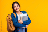 Happy asian female college student smiling at camera on yellow background and copy space, holding laptop and books, hanging bagpack. Youth girl student is exchange student. education concept