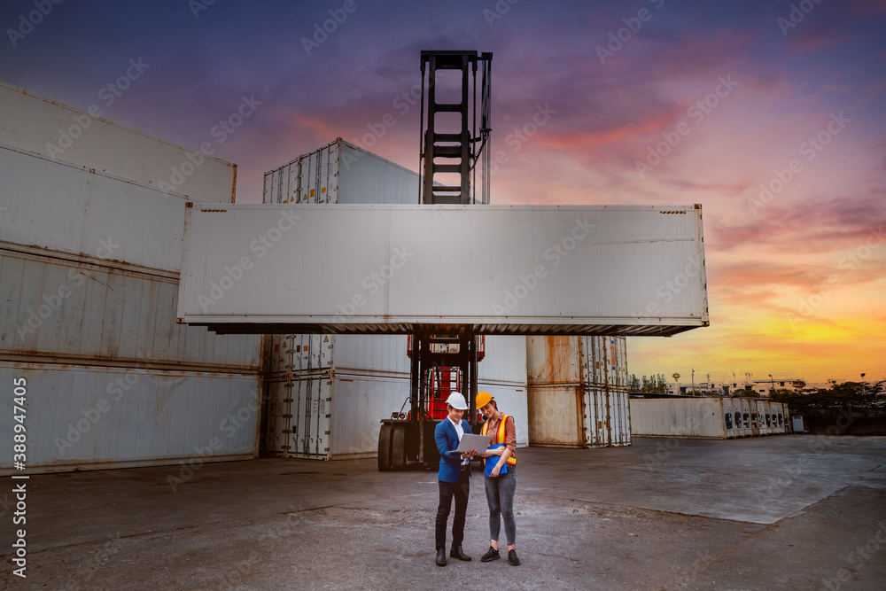 Manager and dock worker under discussion about dock container shipping warehouse document ,they wearing safety uniform hard hat and hold radio communication.