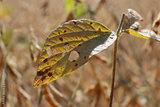 Close-up of dry Soybean plants ready to harvest against sunlight. Cultivated Glycine max