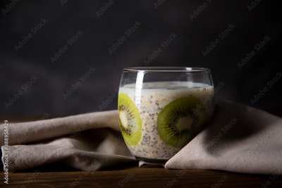 kiwi and raspberry porridge with oat milk and chia seeds on brown wooden table