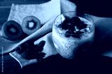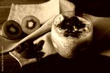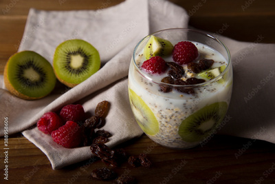 kiwi and raspberry porridge with oat milk and chia seeds on brown wooden table