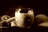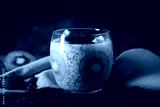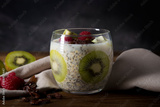kiwi and raspberry porridge with oat milk and chia seeds on brown wooden table