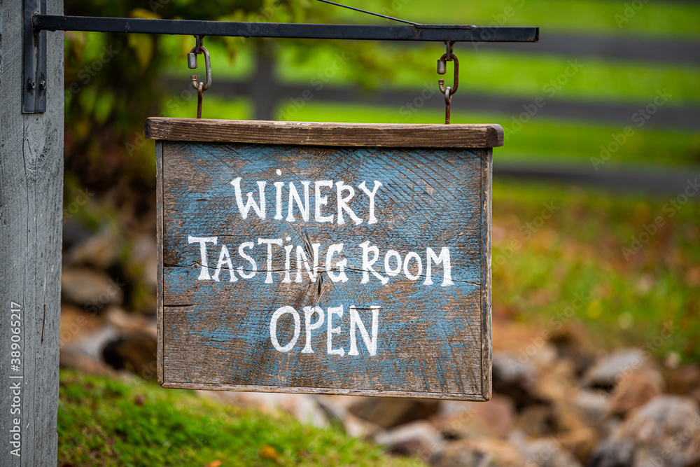 Closeup of Winery Tasting Room Open sign with bokeh background of grape vineyard winery farm landscape