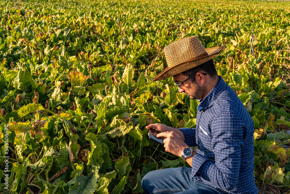 Smart farming, using modern technologies in agriculture. young man agronomist farmer with smart phone in sugar beet farm using apps and internet of things(IOT) in production and agricultural research