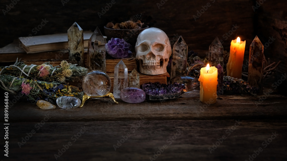 human skull, gemstones, candles on on dark background. Crystals Stones Set. healing minerals for Magic Rock Ritual, Witchcraft, spiritual practice. Esoteric, halloween.