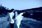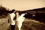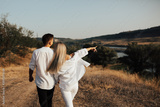 Back view of couple walking at nature. Girl in white clothes show girl point finger at beautiful landscape.