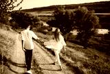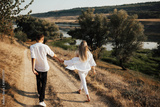Rear view of couple holding hands and walking in beautiful countryside. Young couple walking through road.