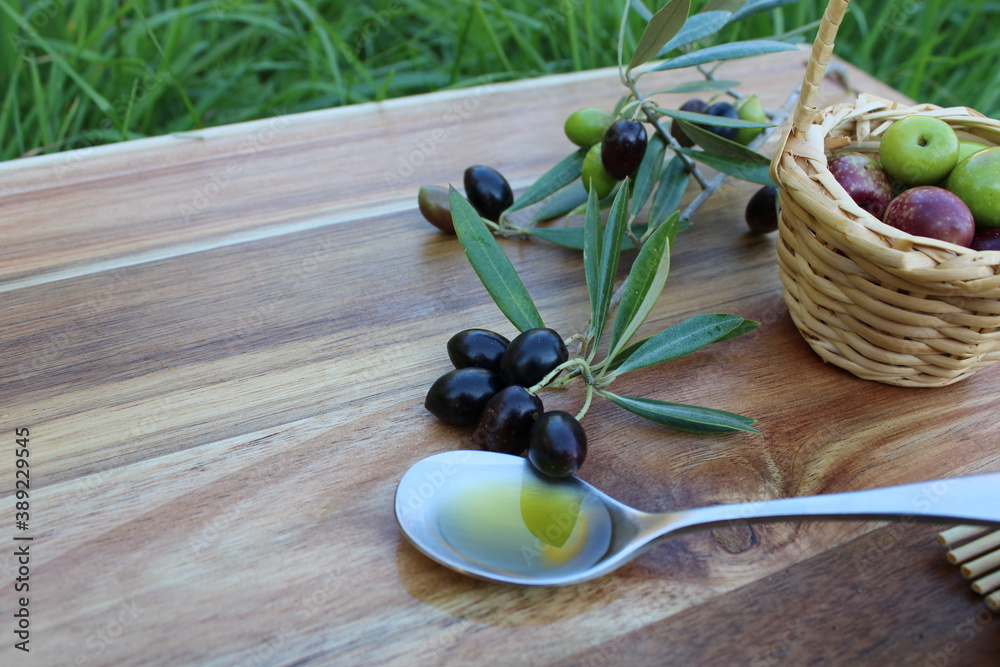 Branche d'olives et cuillère d'huile d'olive