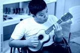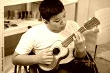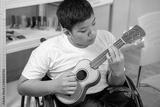 disability kid playing music with guitar on wheelchair with Autism child playing in special classroom