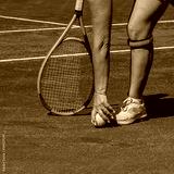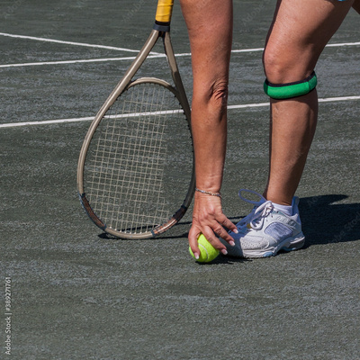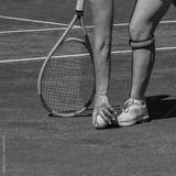 Female tennis player with racquet, picks up ball