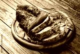 Roasted pork tenderloin on a wooden background
