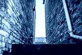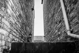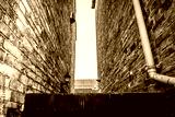 Abstract monochrome view between to very old, brick built houses. Showing a distant solar panel attached to a newer houses roof.