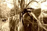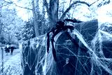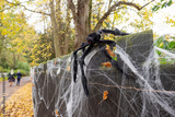 Newly installed Halloween trick spider and fake cobwebs seen on a garden fence.