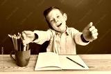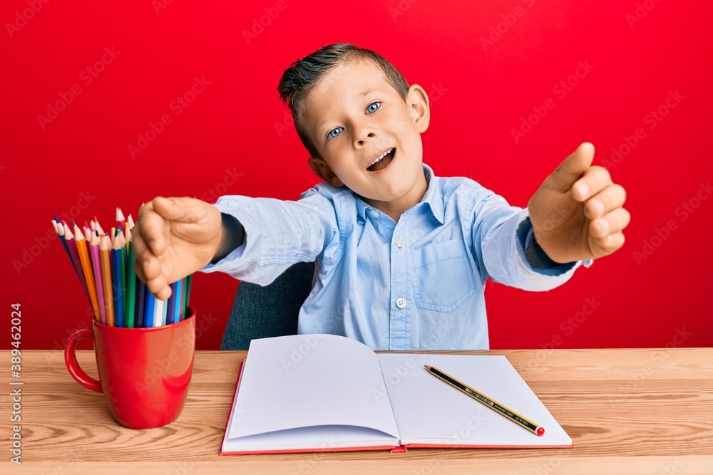 Adorable caucasian kid writing book sitting on the table looking at the camera smiling with open arms for hug. cheerful expression embracing happiness.