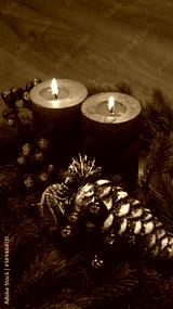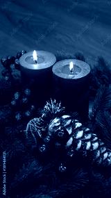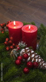 Red candles with fir branches and a toy pine cone. Dark Christmas and New Year background. Red candles, green spruce branches, red berries.