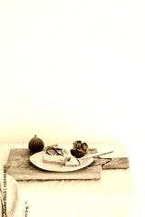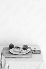 Slice of homemade gluten free fig cheesecake with fresh figs pieces and fork on white plate over rustic wooden board, white wall at background, copy space. Healthy dessert, artisan sweet food concept