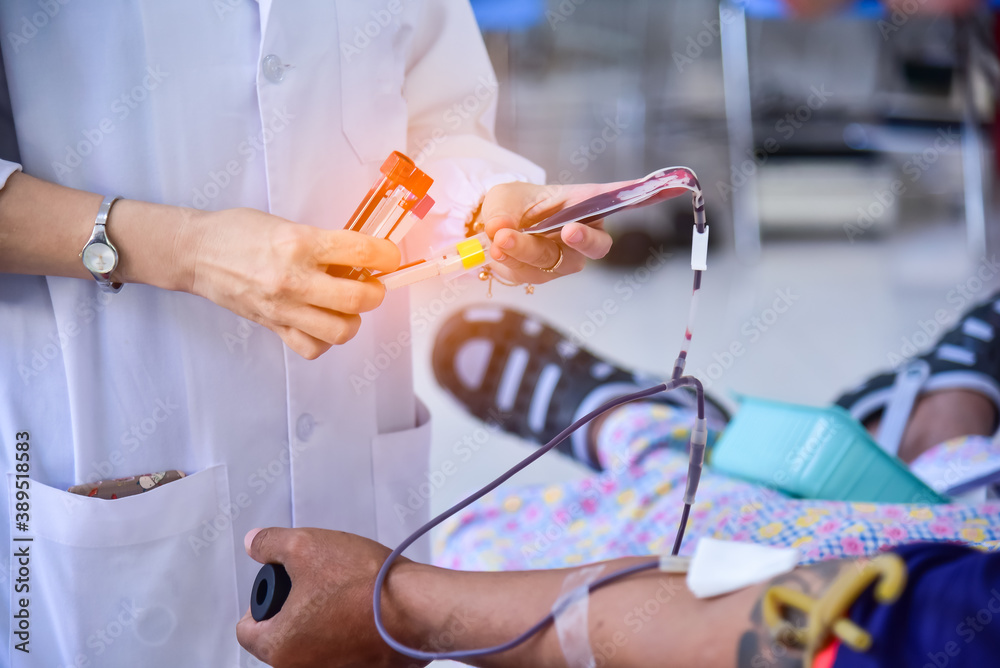 Nurse checking access at blood transfusion of blood donor at hospital.