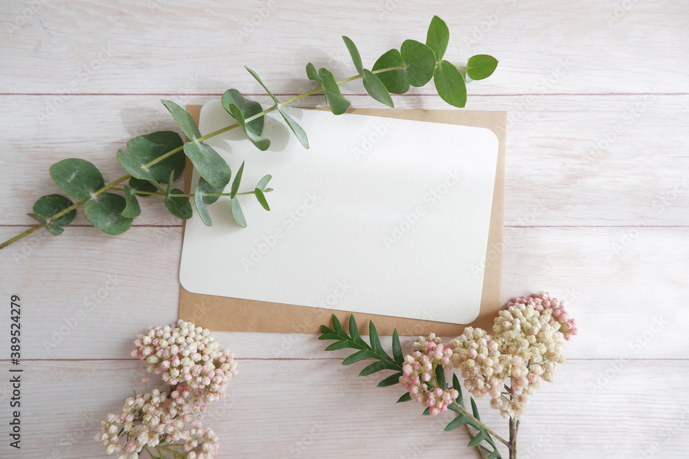 Empty card with flowers and green leaves on wooden background. ウッドテーブルを背景にカードと白い花と緑ドライフワラー